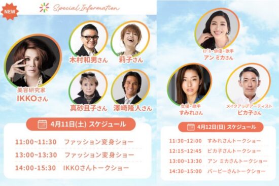 イベントステージでは、2日間を通して豪華ゲストによるトークショーを開催します。QVCの番組出演で支持を集めるIKKOさんをはじめ、すみれさん、ピカ子さん、アン ミカさん、バービーさん、KIMIKOさんなど、美と健康のスペシャリストたちが続々登場。ここでしか聞けないトークをお届けします。