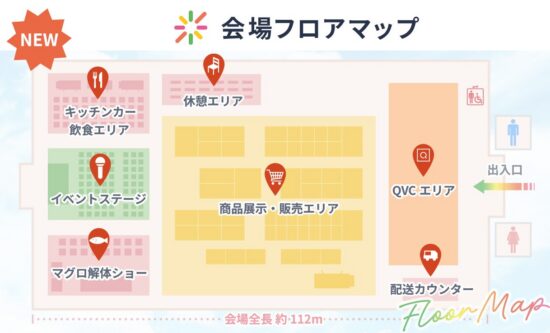 会場では、QVCで取り扱いのあるメーカーやブランドによる「商品展示・販売エリア」、QVCの歩みや施策を紹介する「QVCエリア」をはじめ、バラエティ豊かなブースを展開します。